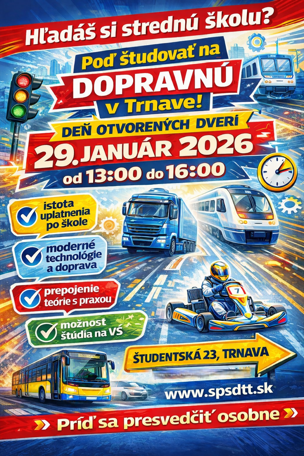 Srdečne pozývame uchádzačov o štúdium a ich rodičov, zvlášť ešte nerozhodnutých, ako i výchovných poradcov na, v tomto školskom roku, posledný - tretí - Deň otvorených dverí, vo štvrtok 29.1.2026 od 13 do 16 hod.